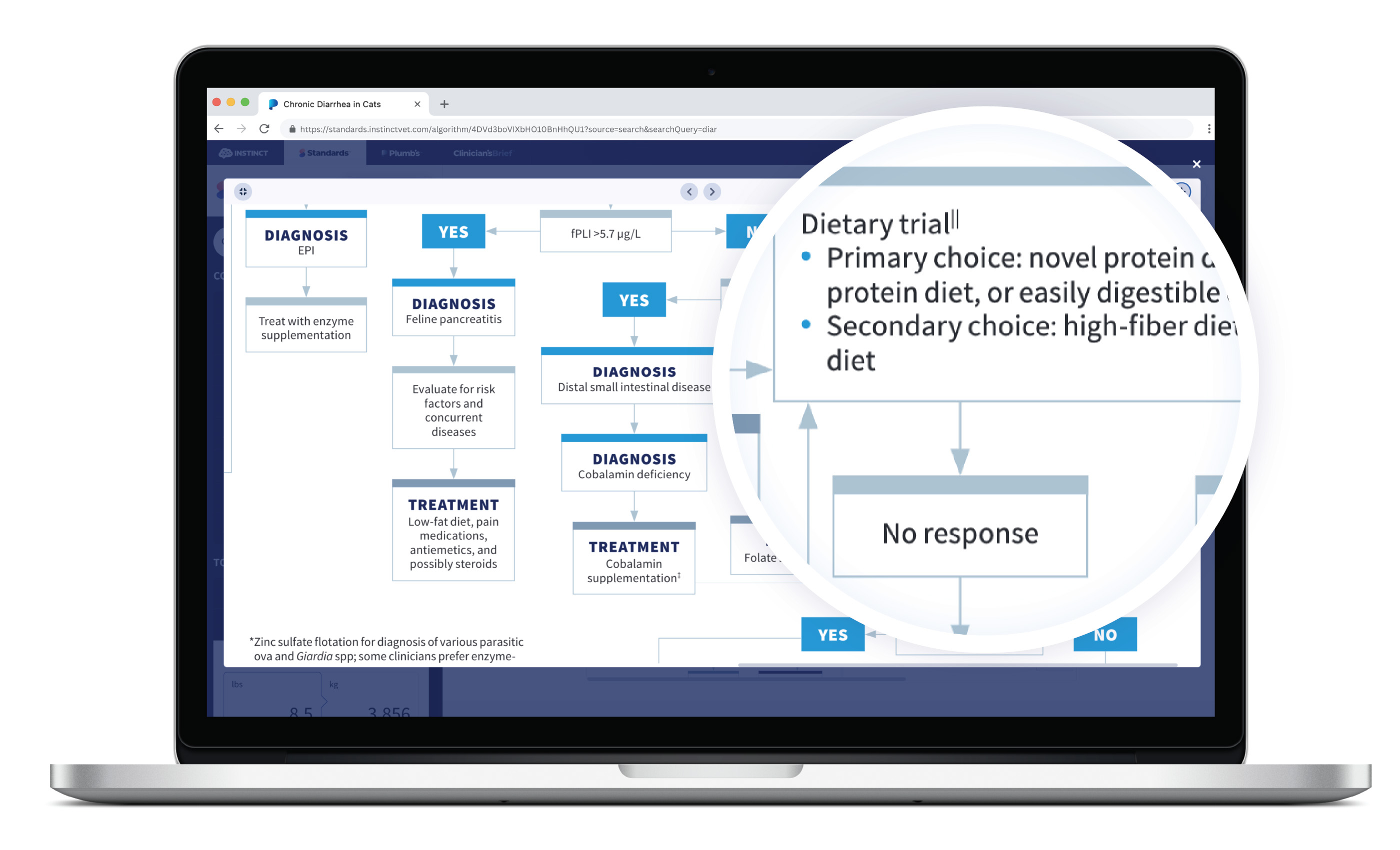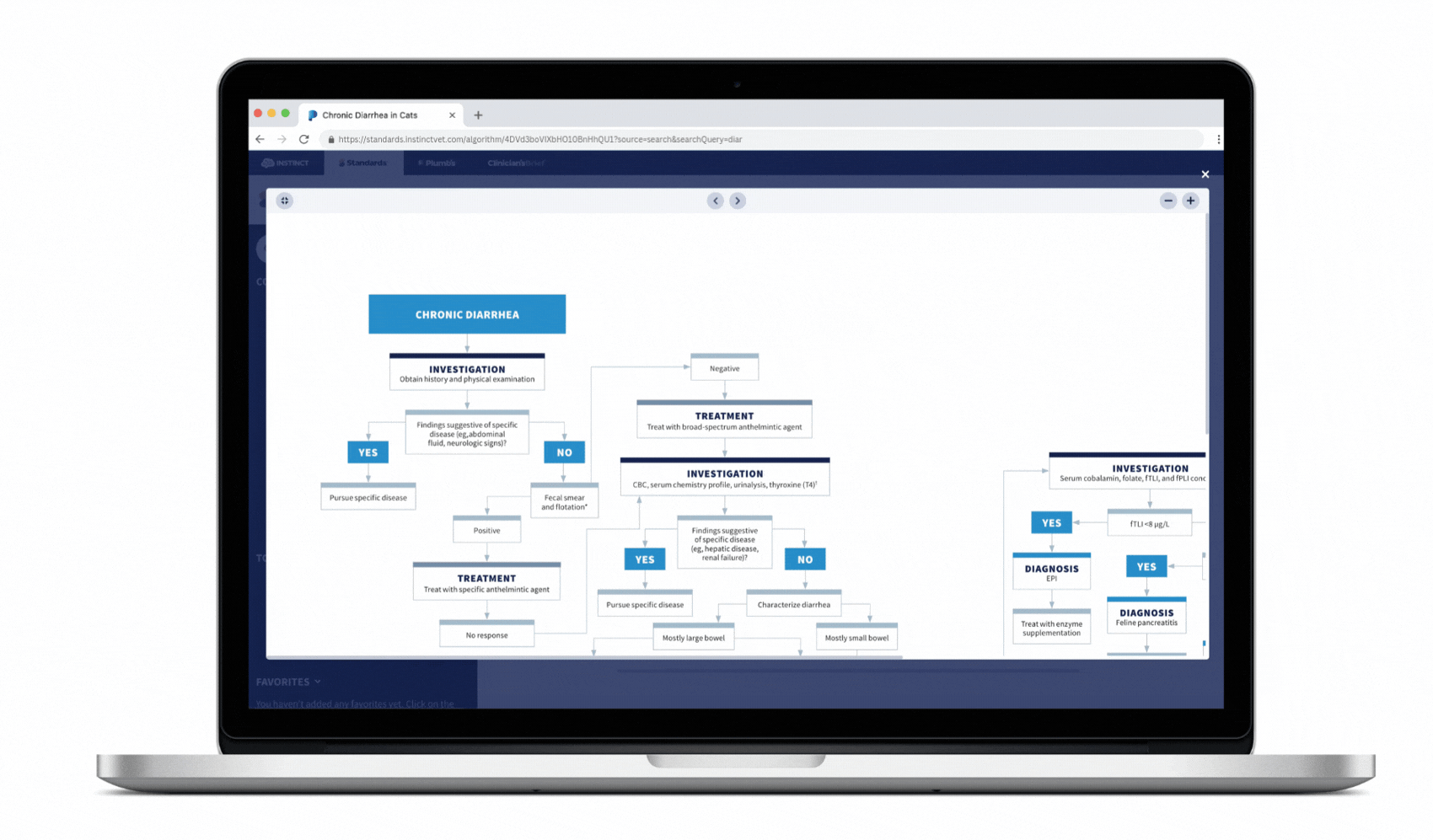 Now that you have a solid understanding of Kevin’s history, it’s time to decide on your next steps for diagnostics and treatment. To make sure you’re covering all your bases, you turn back to Standards™ and open the algorithm on chronic diarrhea in cats.