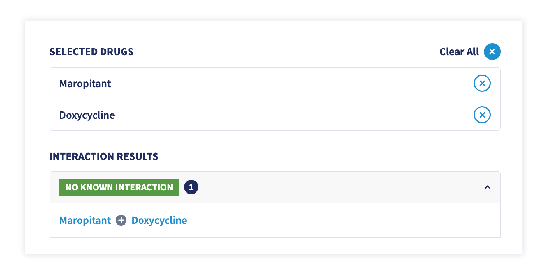 You’d also like to start Brew on maropitant for nausea, and while you’re fairly sure you can use doxycycline and maropitant together without risking a drug interaction, you quickly confirm that’s the case with the drug interaction checker.