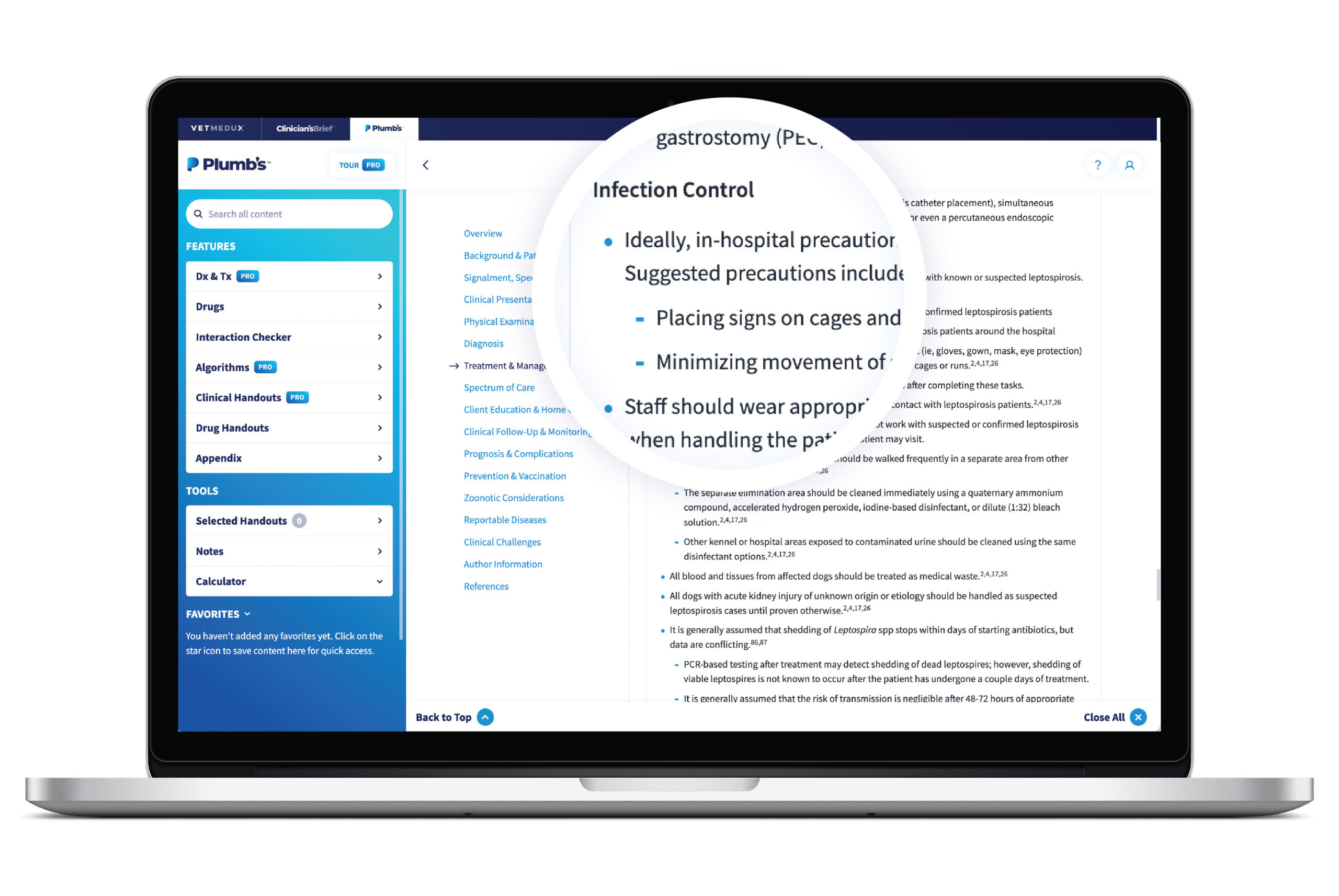 As you continue reviewing the Dx & Tx, you’re reminded that leptospirosis is zoonotic and review the infection control section to ensure you’re doing everything you can to keep your veterinary team safe.