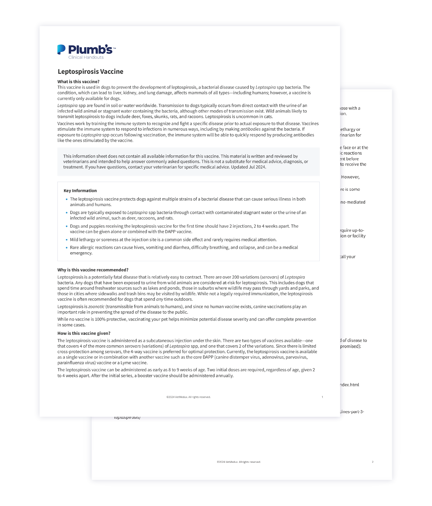 You’re confident that you’re following the latest recommendations for treating leptospirosis and hope that Brew will be feeling better soon. Now you’re ready for your next patient, and with Plumb’s Pro™ by your side, you can quickly and confidently manage whatever you find in the next exam room.