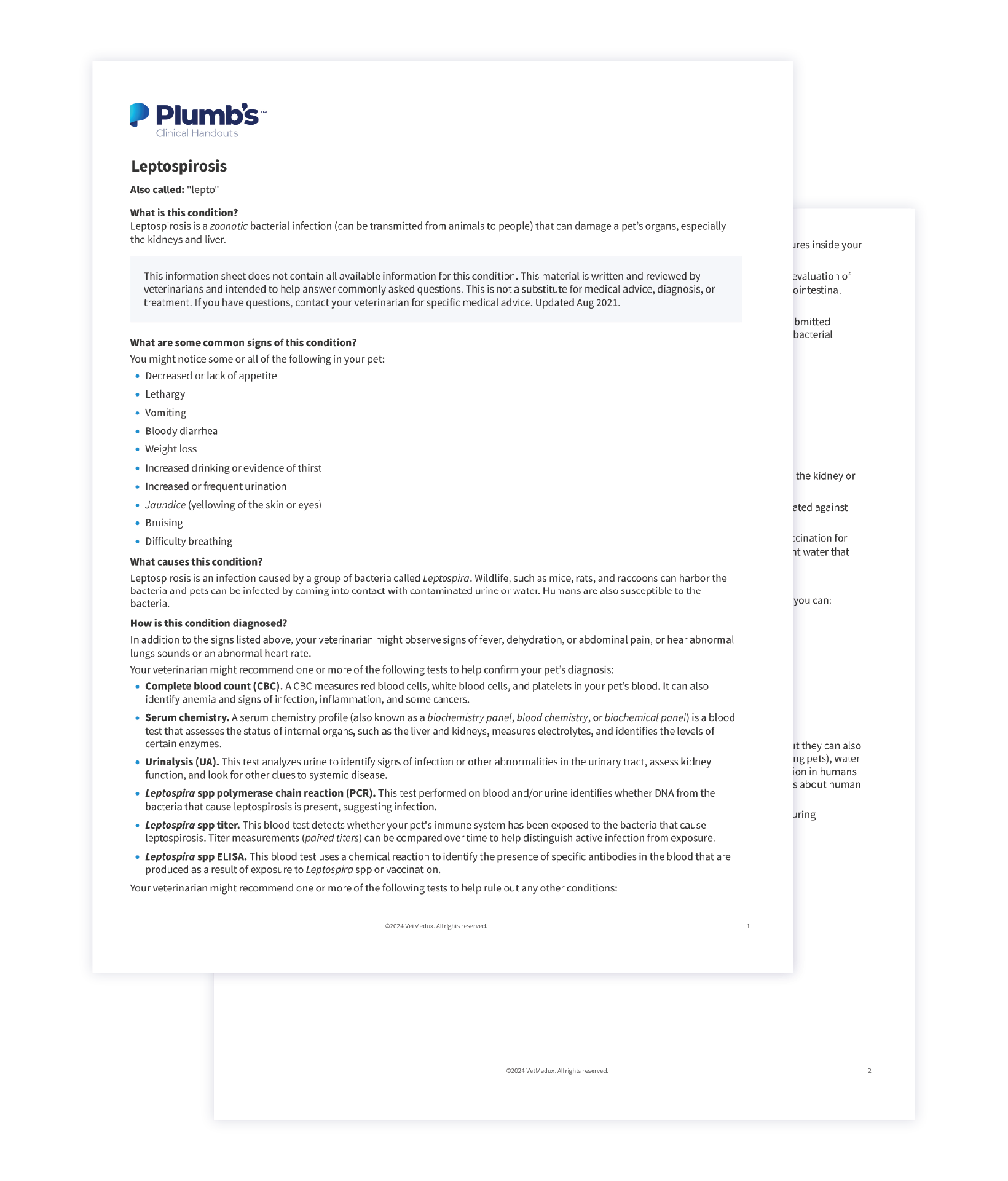 You’ve got a lot of information to discuss with Jeff today, and you want to ensure he’s fully informed about Brew’s condition and your recommendations, so you print the clinical handout on leptospirosis. You go through the handout with Jeff, highlighting the most important points.