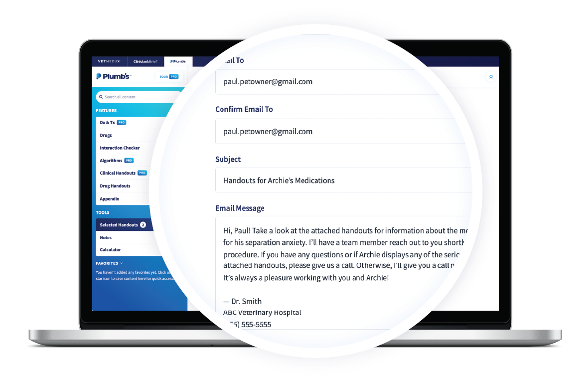 You find the drug handouts for fluoxetine and alprazolam and email them to Paul directly from Standards™. There’s a spot to add a personalized message before you send the email, so you let him know you’ll have a veterinary team member contact him to schedule Archie’s dental procedure.