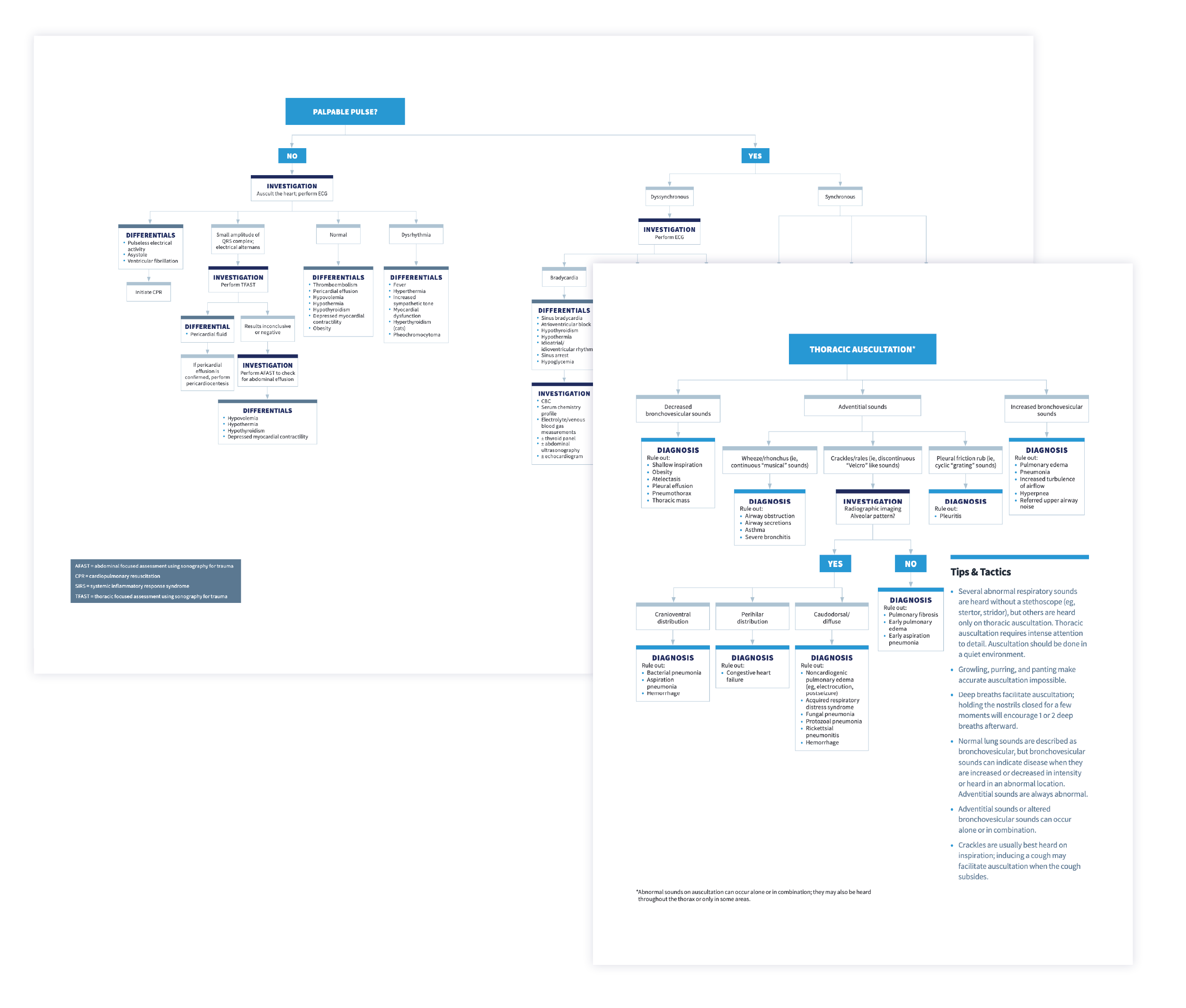 For instance, when you find abnormal respiratory sounds or pulse alterations on initial assessment, you can review an algorithm to figure out what’s next while your technician administers oxygen and starts IV fluids.