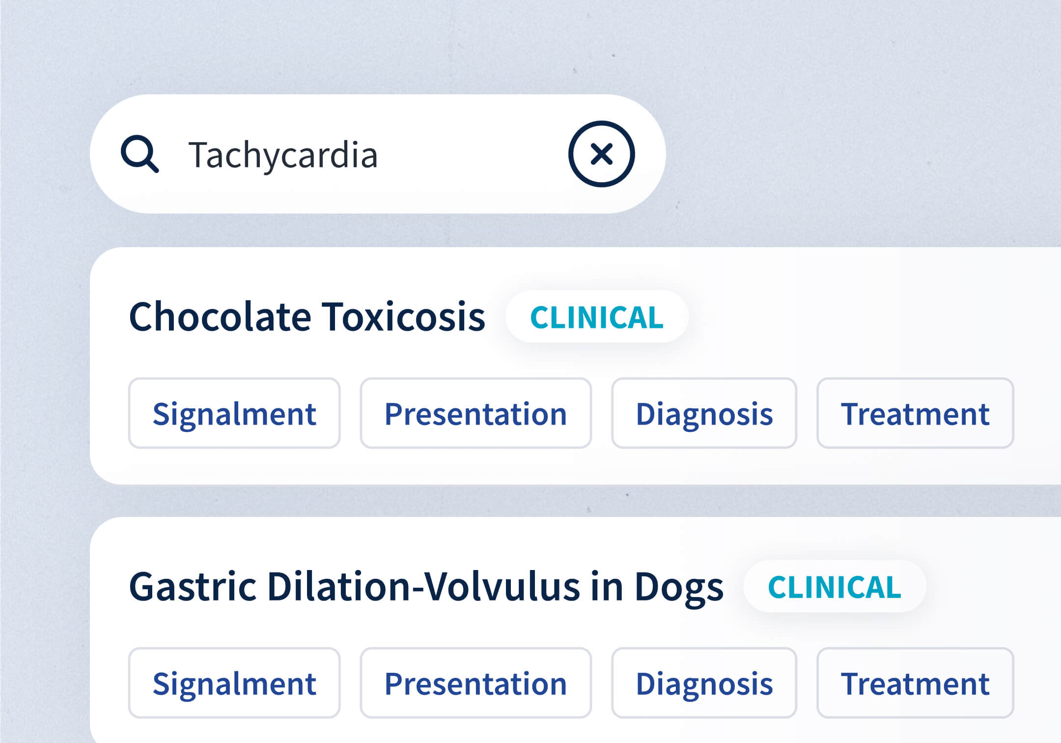 Start typing a disease or clinical sign and results will automatically populate. Convenient filters help you narrow your search by content type.